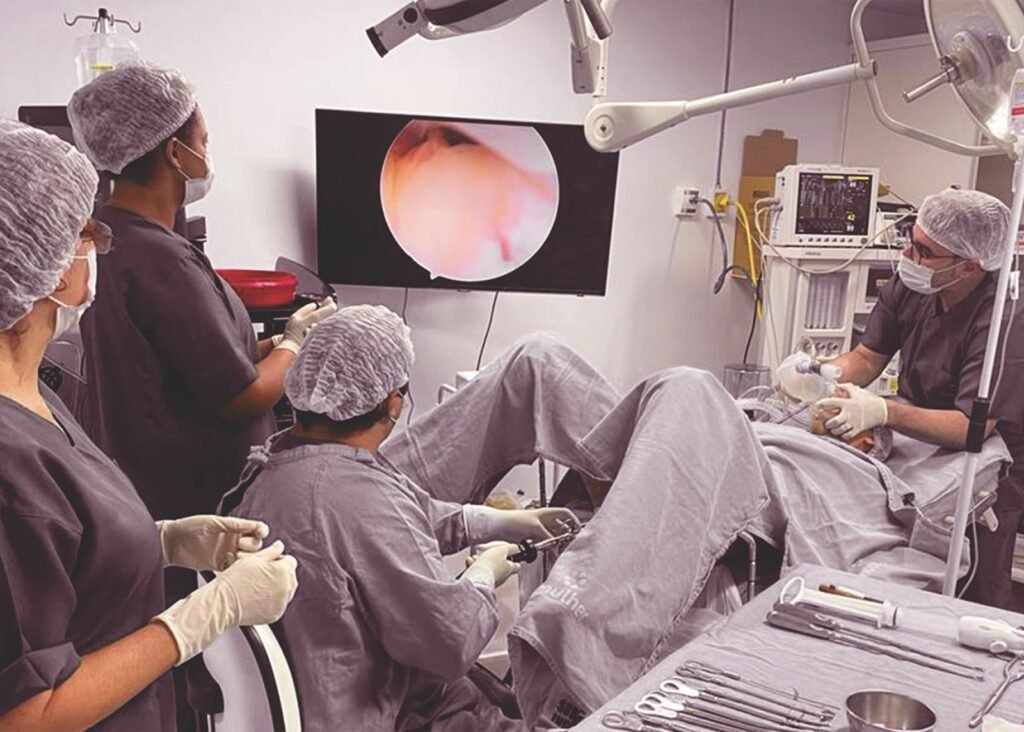 Todo o procedimento é feito com o auxílio de uma microcâmera, que transmite as imagens para um monitor, garantindo precisão e segurança.